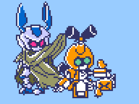 「描け」という幻聴が聞こえたもので。 ロックマン風(今回出来が少々自信無いのでわざわざ書く)のシュシュポップとリアリラ・・・の、つもり。 #メダロット #メダロットS #ドット絵 #シュシュあーと #リアリラあーと