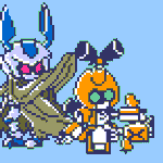 6 17 1年振りにドット絵描いたわ。今やってるメダ2風オープニングに触発されて。引き続きロックマン風のだけど、クロスメサイアを前描いたやつから微妙に修正したのと新作ファンシーエール。そして宣言通りもう満足w #メダロット #メダロットS #ドット絵 21/02/03 19:30