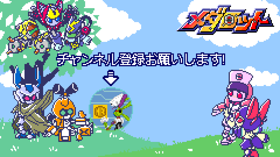YouTubeメダロットニュースの終了画面のほんわかイラストをドット絵化してみました。 一応チャンネル登録を勧める新旧アイコン有りバージョンも作りましたが、解像度をイラストの方に合わせてしまっているのでちょっと出来に自信が無いです; まぁこちらはオマケという事で。 #メダロット #ドット絵
