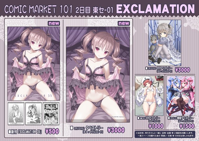 コミックマーケット101 お品書き | 橋本タカシ #pixiv pixiv.net/artworks/10397… C101情報 12/31(土曜日) 東セ-01ab EXCLAMATION / QUESTION お品書きになります! #C101 新刊は、後日メロン様に委託予定です。 どうぞよろしくです m(_ _)m