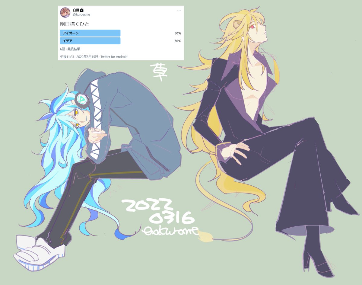 26 61 本日のらくがきなんですが 鍵アカのほうでアンケート取ったら同率になったのでアイオーンさんとイデアさんの二人です、声帯が一緒 22/03/16 22:48