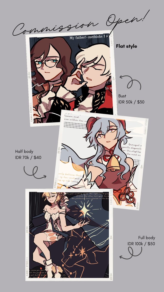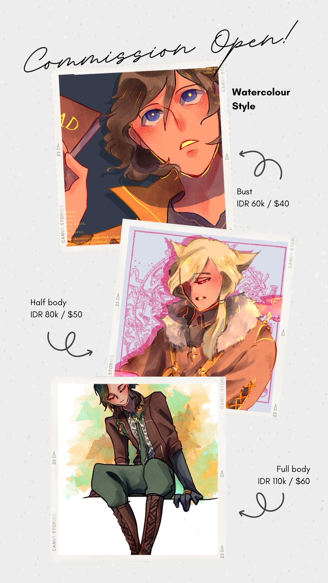 🔅COMMISSION OPEN🔅 New catalogue is up! Due to adding more option + I accidentally deleted my own post. It's open locally (indonesia) and internationally! RT and shares are appreciated! 💕✨ #artcommission #commissionopen #artidn