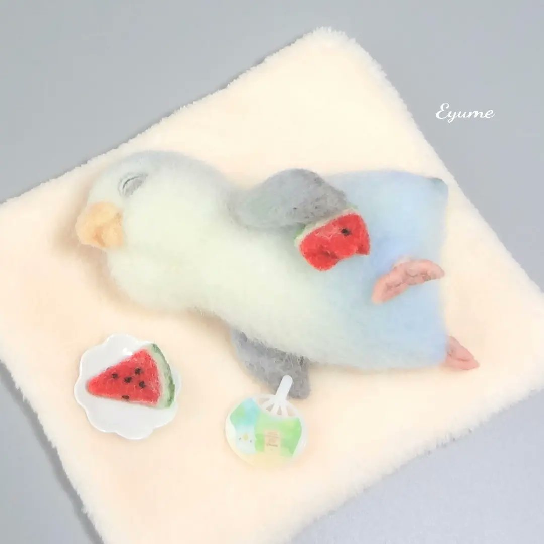 夏仕様の寝落ちインコ完成です🍉 準備ができ次第minneにて販売予定です🌸(販売は一羽ずつになります✨) #羊毛フェルト #インコ #オカメインコ #コザクラインコ #寝落ち