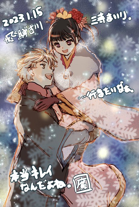 成人式が、1月15日じゃなくなってひさしいけど、#飛騨古川三寺参り って今でも、新成人が、振り袖、晴れ着で参加してるのかな。何回か通ってるけど、この時期は行きたくてソワソワする。町の雰囲気良いし、綺麗なんだよね。行きたいなぁ。#オリキャラカップル #絵描きさんと繋がりたい #イラスト