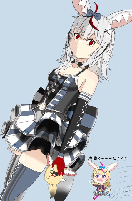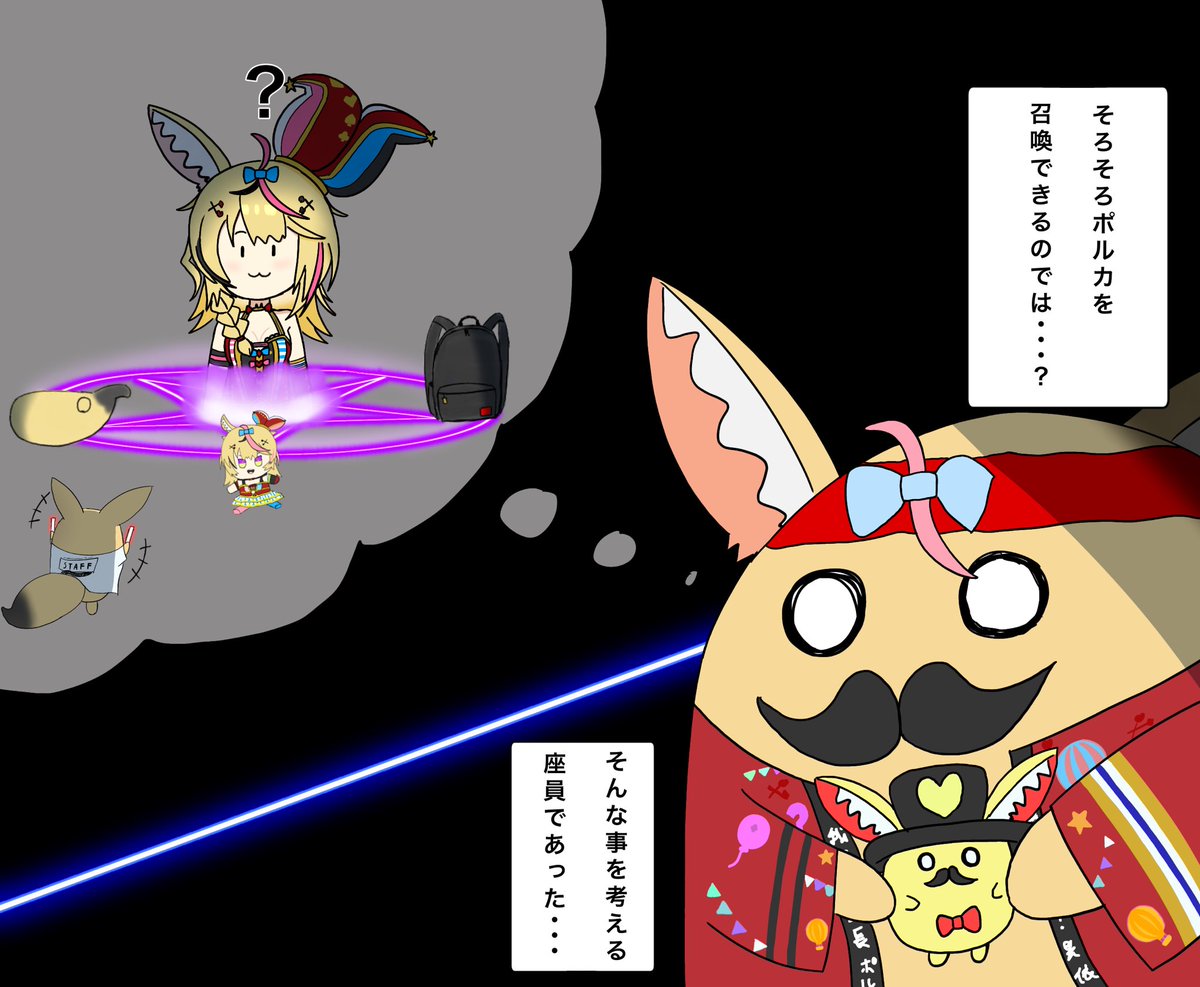 推しグッズを身につけるギャルポルカ しがみつく助手くんと座員はネタ方向で考えてた時の名残り 5期生要素も少しだけ 特等席は譲らん #絵まる #尾丸ポルカ新衣装予想