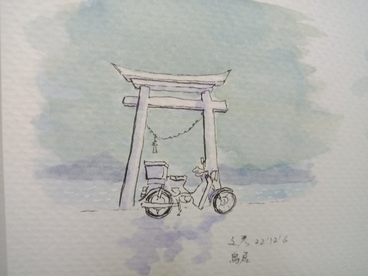 2 79 #15分シリーズ ツイートで見た写真を勝手に15分でスケッチしてみた。 第268弾 #鳥居 #スケッチ #イラスト #スーパーカブ #呉竹透明水彩 22/12/08 07:11