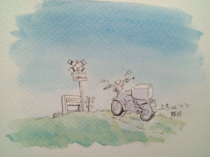 1 31 #15分シリーズ ツイートで見た写真を勝手に15分でスケッチしてみた。 第271弾 #踏切 #スケッチ #イラスト #スーパーカブ #呉竹透明水彩 22/12/11 06:25