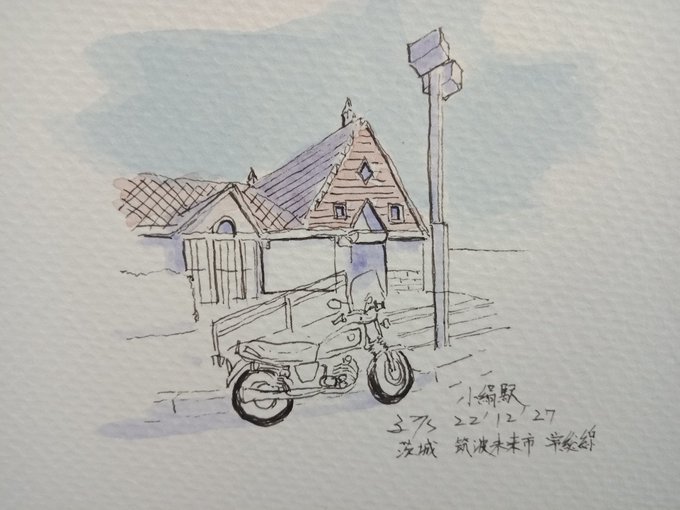 1 49 #15分シリーズ ツイートで見た写真を勝手に15分でスケッチしてみた。 第283弾 #小絹駅 #スケッチ #イラスト #茨城県 #筑波未来市 #常総線 #駅 #SR400 #呉竹透明水彩 22/12/28 07:10