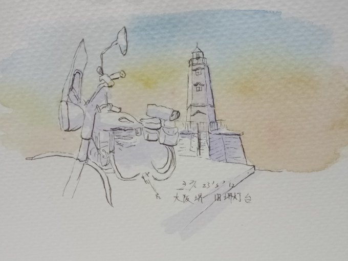 1 63 #15分シリーズ ツイートで見た写真を勝手に15分でスケッチしてみた 第323弾 #旧堺燈台 #スケッチ #イラスト #大阪 #堺市 #灯台 #RoyalEnfield #呉竹透明水彩 23/03/13 07:00