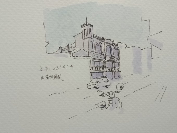 1 43 #15分シリーズ ツイートで見た写真を勝手に15分でスケッチしてみた 第336弾 #旧歯科病院 #スケッチ #イラスト #雲林 #西螺老街 #スーパーカブ #呉竹透明水彩 23/04/05 07:03