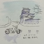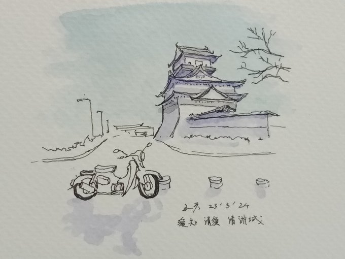 #15分シリーズ ツイートで見た写真を勝手に15分でスケッチしてみた 第33弾 #清洲城 #スケッチ #イラスト #愛知県 #清須市 #スーパーカブ #C125 #呉竹透明水彩