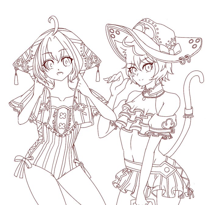メイジーちゃんとアルスちゃん 水着が見たいなって描いてみたはいいものの、元の二人のお洋服の可愛さを全く引き出せてない気がする…… ちゃんと色塗りするかは未定 ※衣裳捏造注意