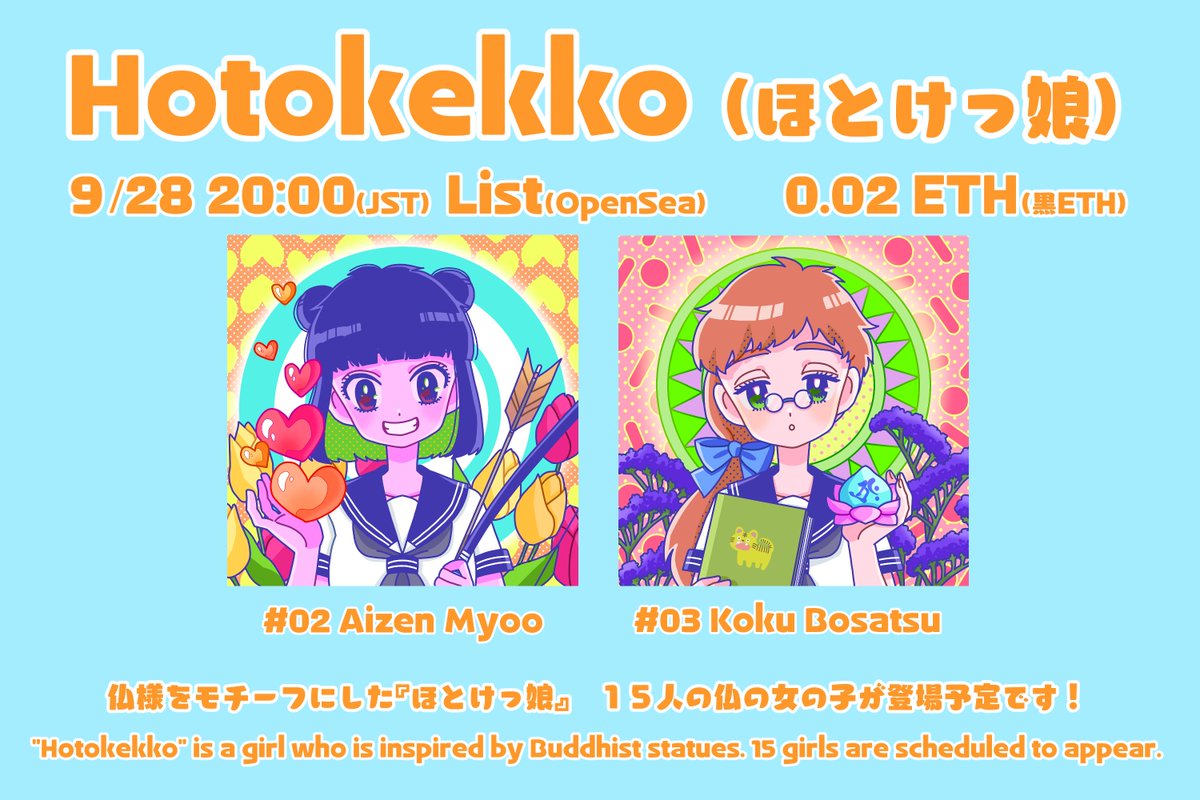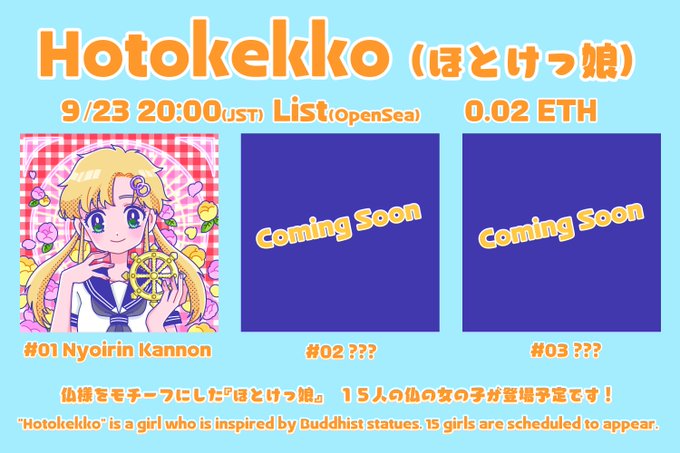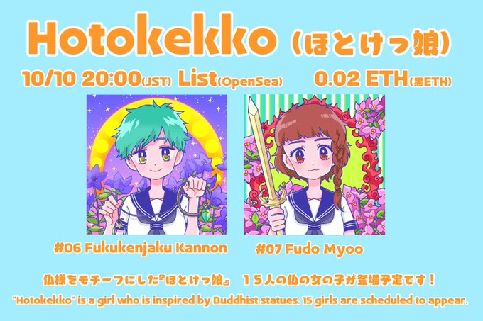 6 21 近々OpenSeaにて初コレクション「ほとけっ娘(Hotokekko)」をリリース予定です! 💛仏教の仏様たちを女の子にしたコレクション 💛女の子たちは15人の予定 お好みの仏様に出会えて貰えたら嬉しいです! #NFT #NFTart #NFTJapan 22/09/20 03:49
