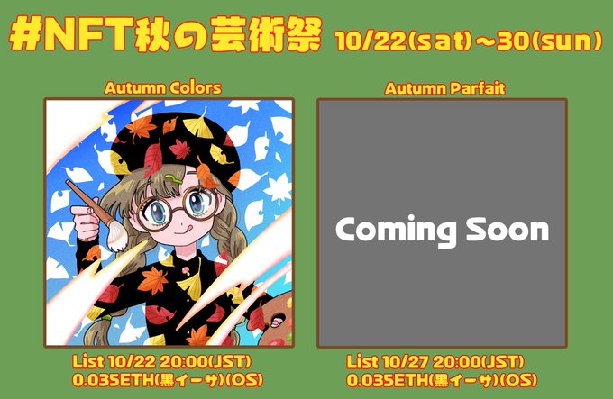 24 41 #NFT秋の芸術祭 のオンサイバーでの展示作品です🥰 opensea.io/ja/collection/… 前半戦と後半戦、1枚ずつ展示させて頂きます💛 #NFT #NFTart #NFTjapan 22/10/21 18:45