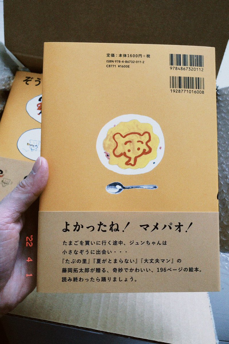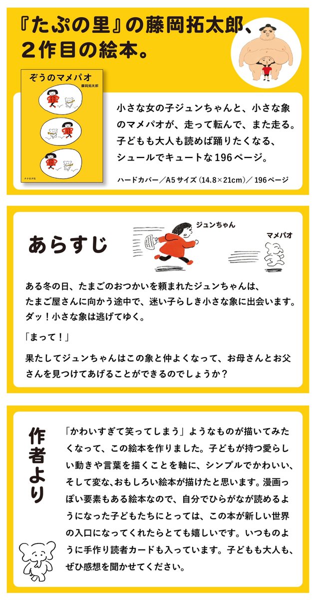 196ページの絵本『ぞうのマメパオ』、カバー初公開です! 4月の上旬から、書店に並び始めます。(本の到着日は書店によって異なります。僕や各書店さまのSNSもぜひ参考にしてください) 『ぞうのマメパオ』(ナナロク社)特設ページ takutaro.com/mamepao/