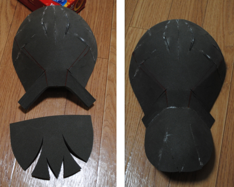 んで、ウツシ教官のお面のとても大事な部位、角をコスプレボード切って作ります。 最初ペラペラだけど、適度に切れ目入れて角度をつければかなりそれっぽくなる。3枚のパーツを組み合わせて立体的にするー #造形 #造形レイヤー #コスプレ