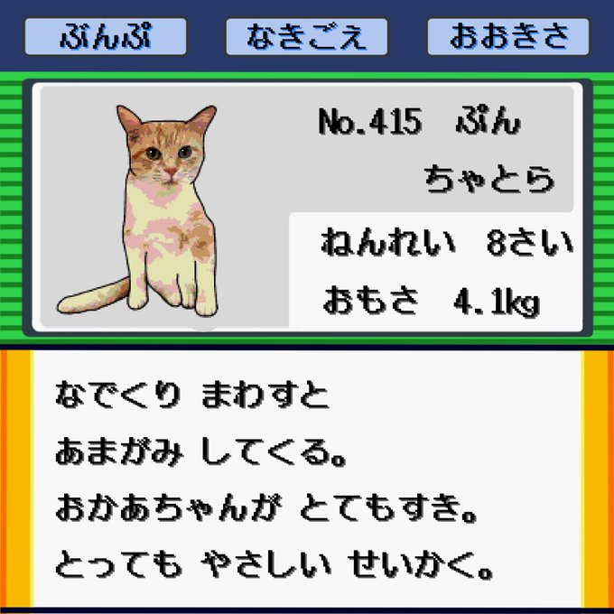 2 17 やったー! ぷんを つかまえたぞ! @nekoko04150126 さんちのぷんちゃん #ねこ #デザイン #ドット絵 twitter.com/fac_l_offici… 22/09/02 17:39