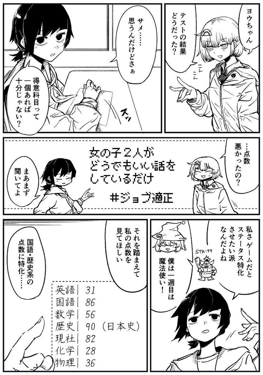 22 52 27日のティアに出す「女の子2人がどうでもいい話をしている」という本です 漫画部分わずか4pとちょっと諸々あるだけのめっちゃ薄い本です。どうでもよさの質としては以下のような感じです。多分ちょっとしか刷らない!よろしく!!!! 22/11/25 17:07