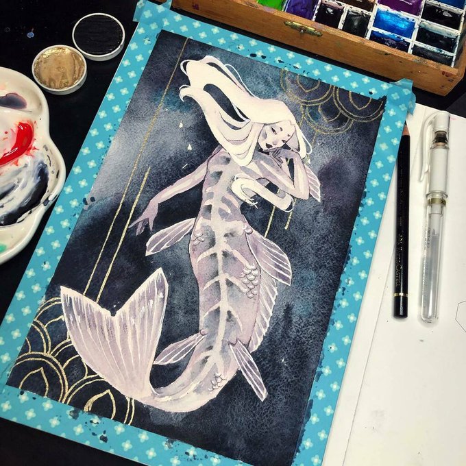 MerMay day 25 Ghost koi! Playing with the dark colors was really fun here. Mostly Payne’s grey and Moonglow with a smidge of Mayan blue. I think Arches has sold me on watercolor block paper. So convenient! #mermay #mermay2020 #mermaid #koi #ghostkoi #ar… instagr.am/p/CAn3EWtjAIT/