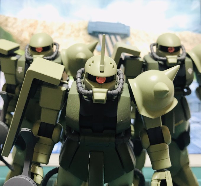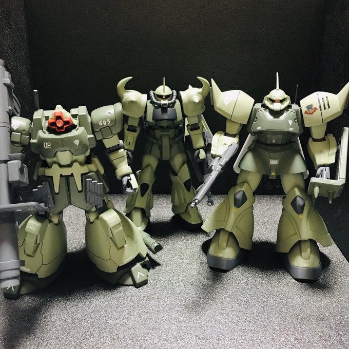 同時進行で作ってたザクさん達 プロ作るときは いつも組立、塗装、スミ入れ、デカールを複数同時進行でやるので、塗装と組み上げが終わるまではバラバラ機体が山積みなのだヾ(ΦωΦ)/ ちなみに三機とも違うキットだけど、どれがどれだか分かるかな? #ガンプラ