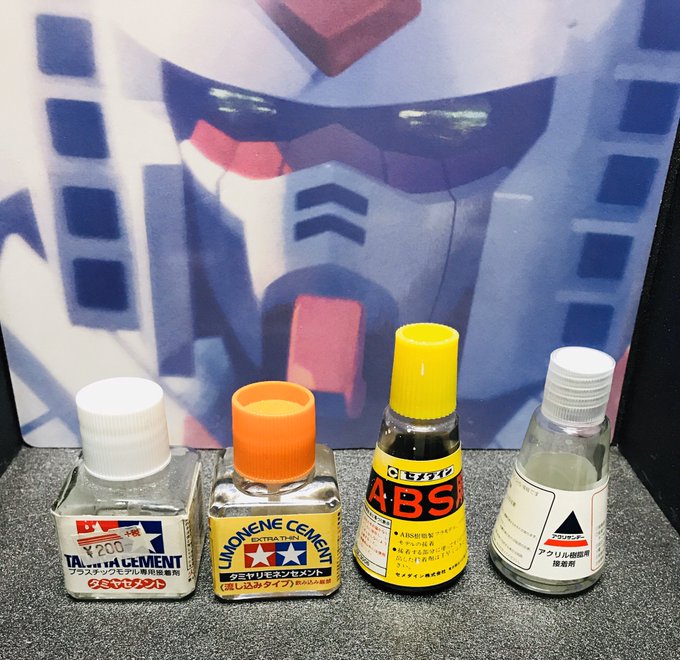 2 5 猫が普段使ってる接着剤を紹介 左から セメント:スタンダード リモネン:溶着力が強く、柑橘系で良い香り でも乾燥に時間が掛かる ABS用:ガンプラならABSとPSの接着が出来る でもタミヤのプラ板は着かない アクリサンデー:比重が軽くて使い難いけど最強 #接着剤 #ガンプラ 20/03/09 19:11