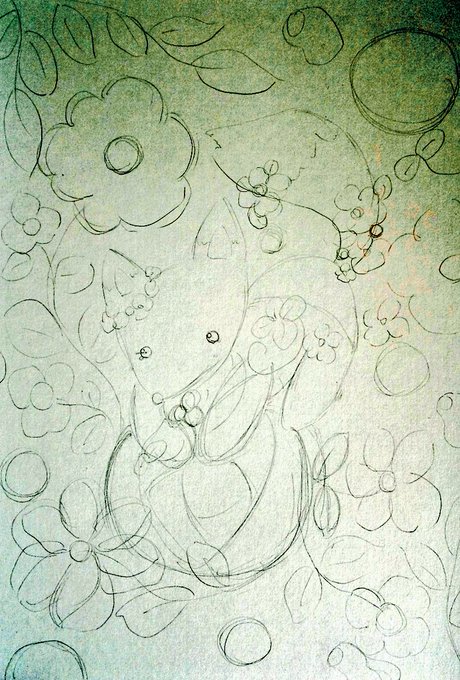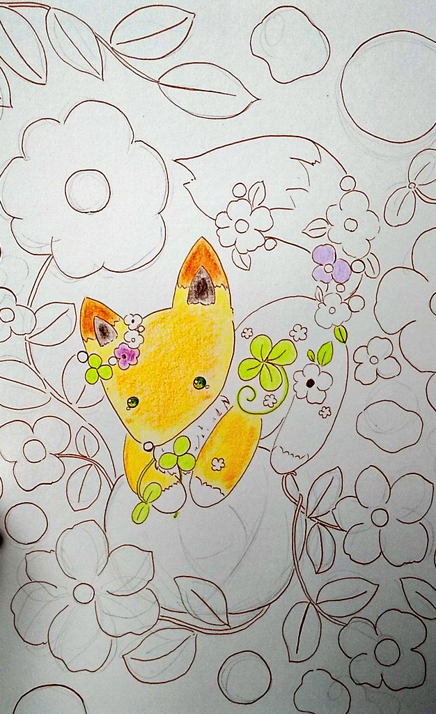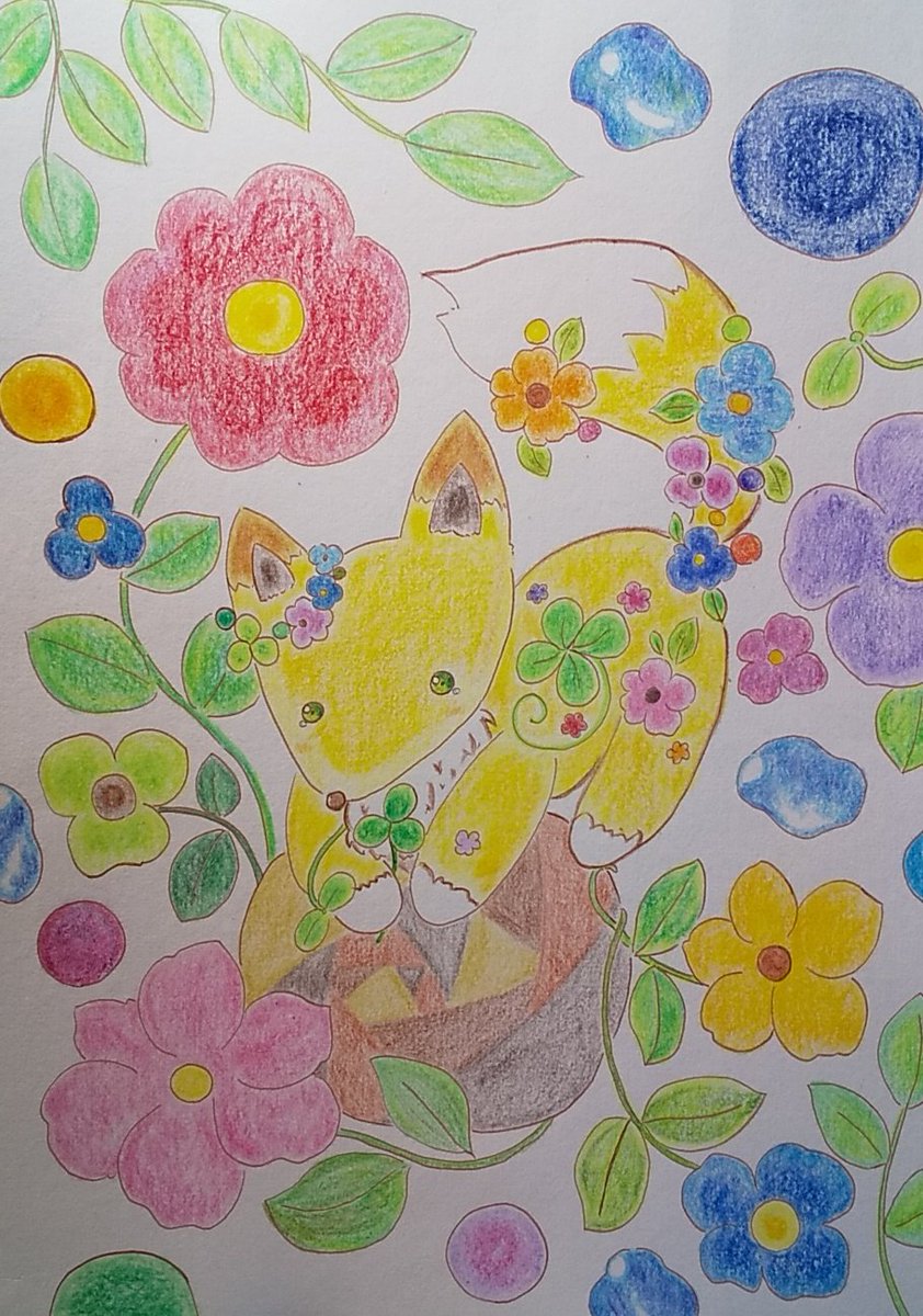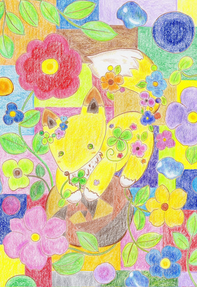 ○お絵描き記録過程 鉛筆でざっくり下描きして、コピックでなぞり… 色鉛筆とパスティック(クーピー)でやわらかく塗りました🦊 背景は特にこだわって、鮮やかになりました🍀 #お絵描き #色鉛筆画 #オリジナル #アナログ #イラスト #illustration