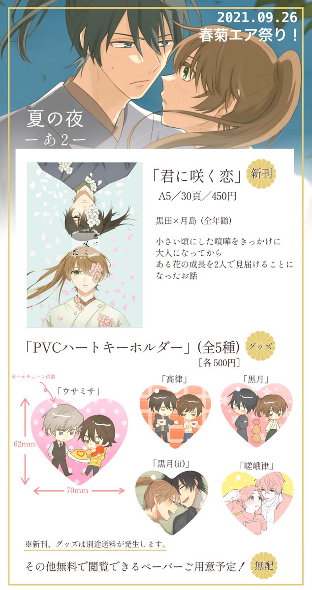 15 65 #春菊エア祭り 9/26の頒布物お品書きになります また、このツイートに新刊サンプルや、注意書き等を繋げていきますので そちらも見ていただけると幸いです、!🧸🐰🐣 21/09/17 22:57