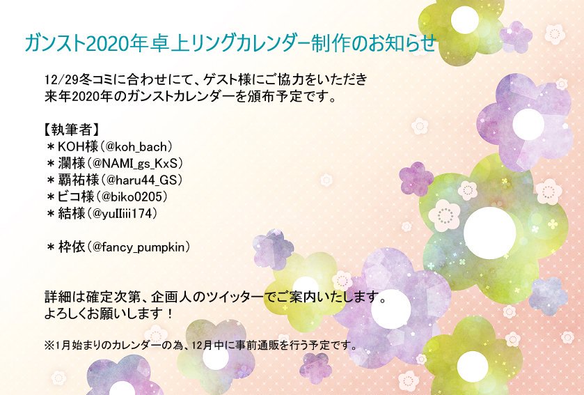 【告知】 冬コミ受かりました!12/29(日)南地区 "ネ "03b caramel pumpkin工房 新刊はイラスト本(2015年に出した本+描きおろし多+オフ刷)と、来年のガンストカレンダーを素敵なゲスト様ご協力のもと作成、頒布の予定です。よろしくお願いいたします! webcatalog.circle.ms/Circle/Map/148… #C97WebCatalog