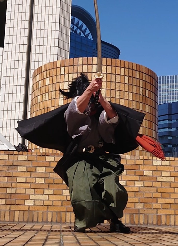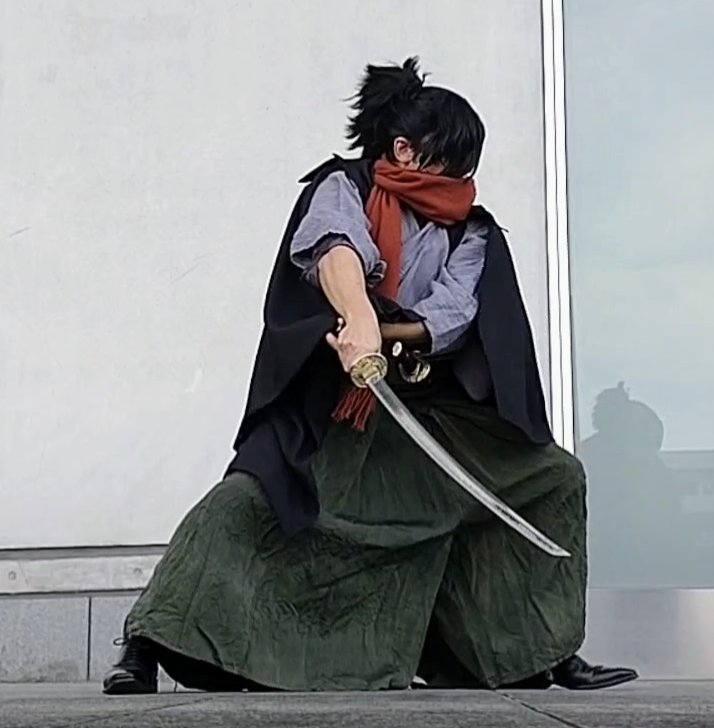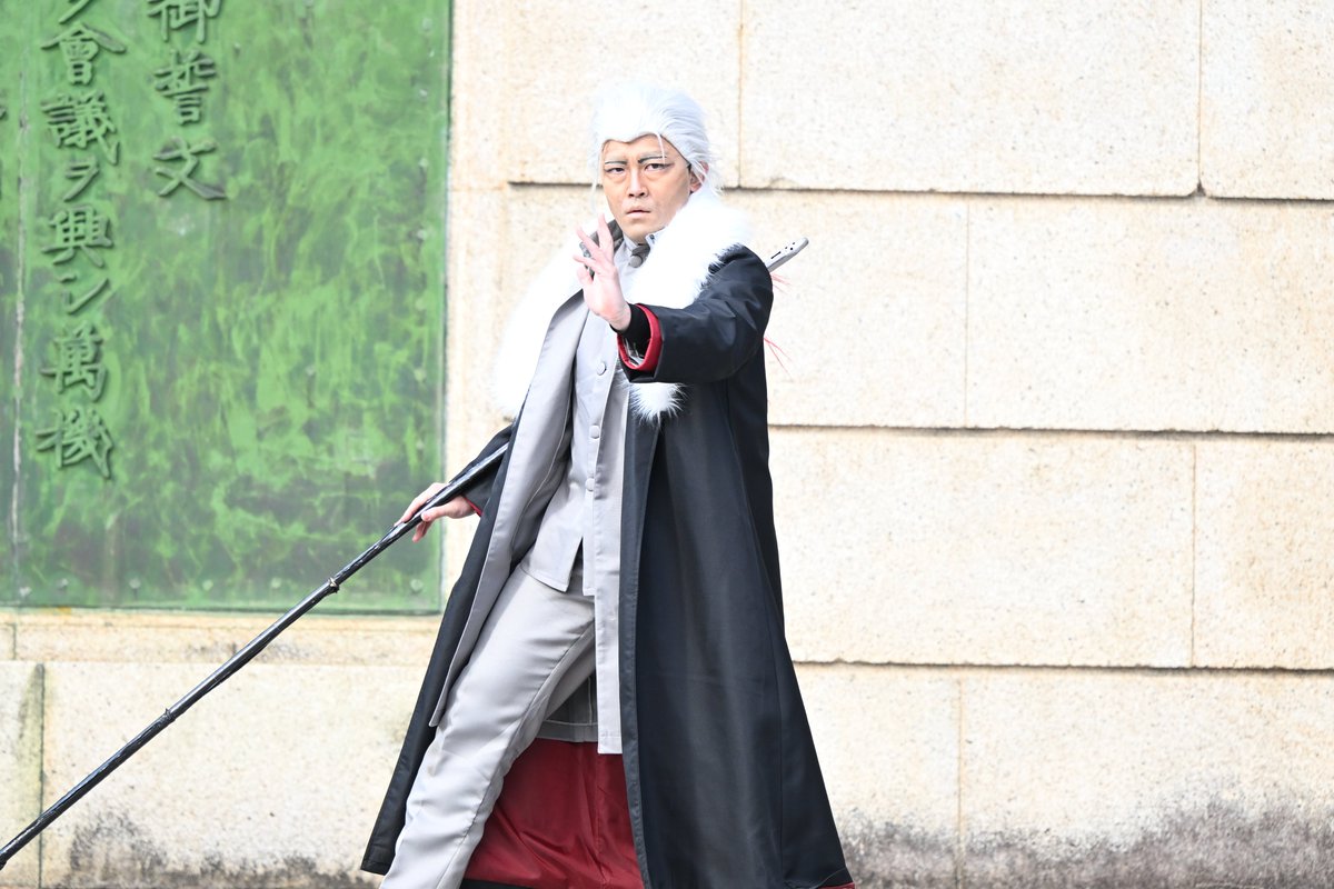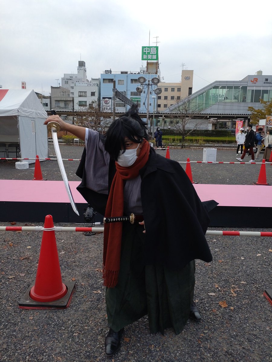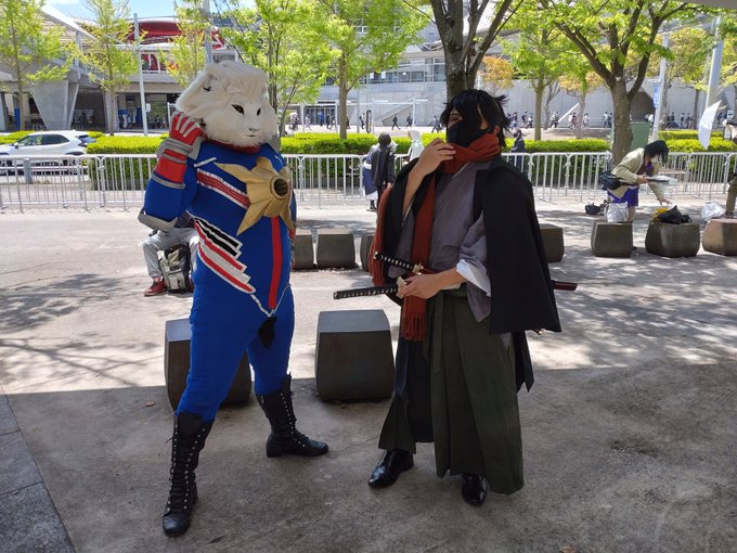 サメ兵士(@BillieNiceguy)を、野良新選組(@gingabancho)と倒そうとする以蔵さんの図。 撮影:天翔ホタルさん(@Hotaru_Games_) #ニコニコ超会議2022コスプレ