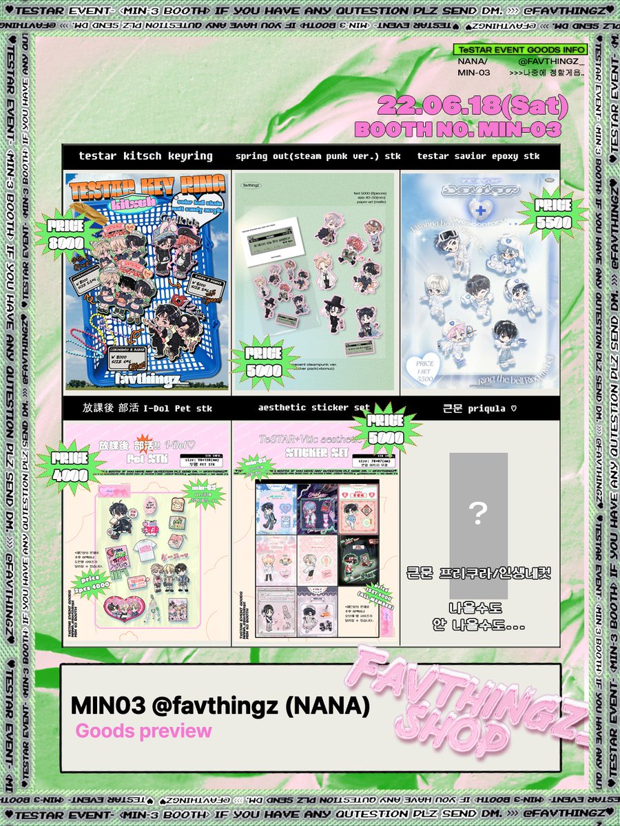 테스배 민03)나중에 정할게욥.. 부스 인포입니다💗🎀 타래로 소량재고 가져갈 인포까지 계속 업데이트할게요 RT해주시는 2분께 추첨으로 원하시는 굿즈 보내드릴게요🥰 선입금X 현장수령으로만 진행하며 수요조사 진행합니다! 꼭 구매해주실 분만 참여 부탁드려요😭 🤍>> witchform.com/demand_form/46…