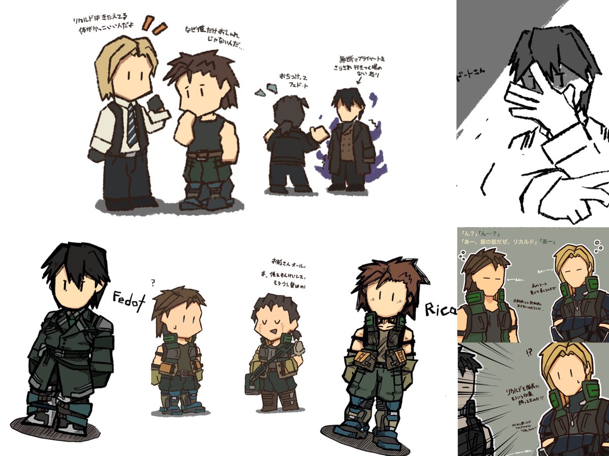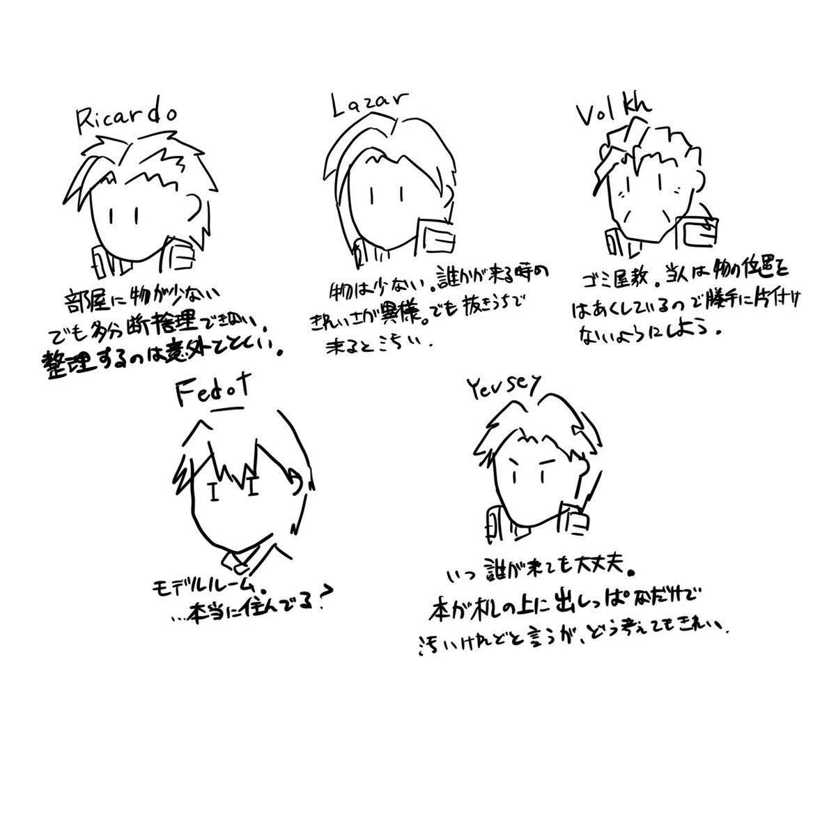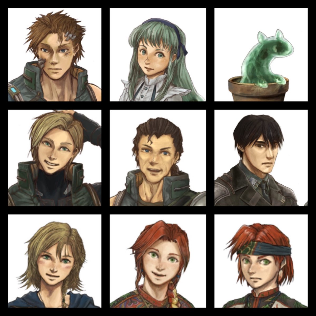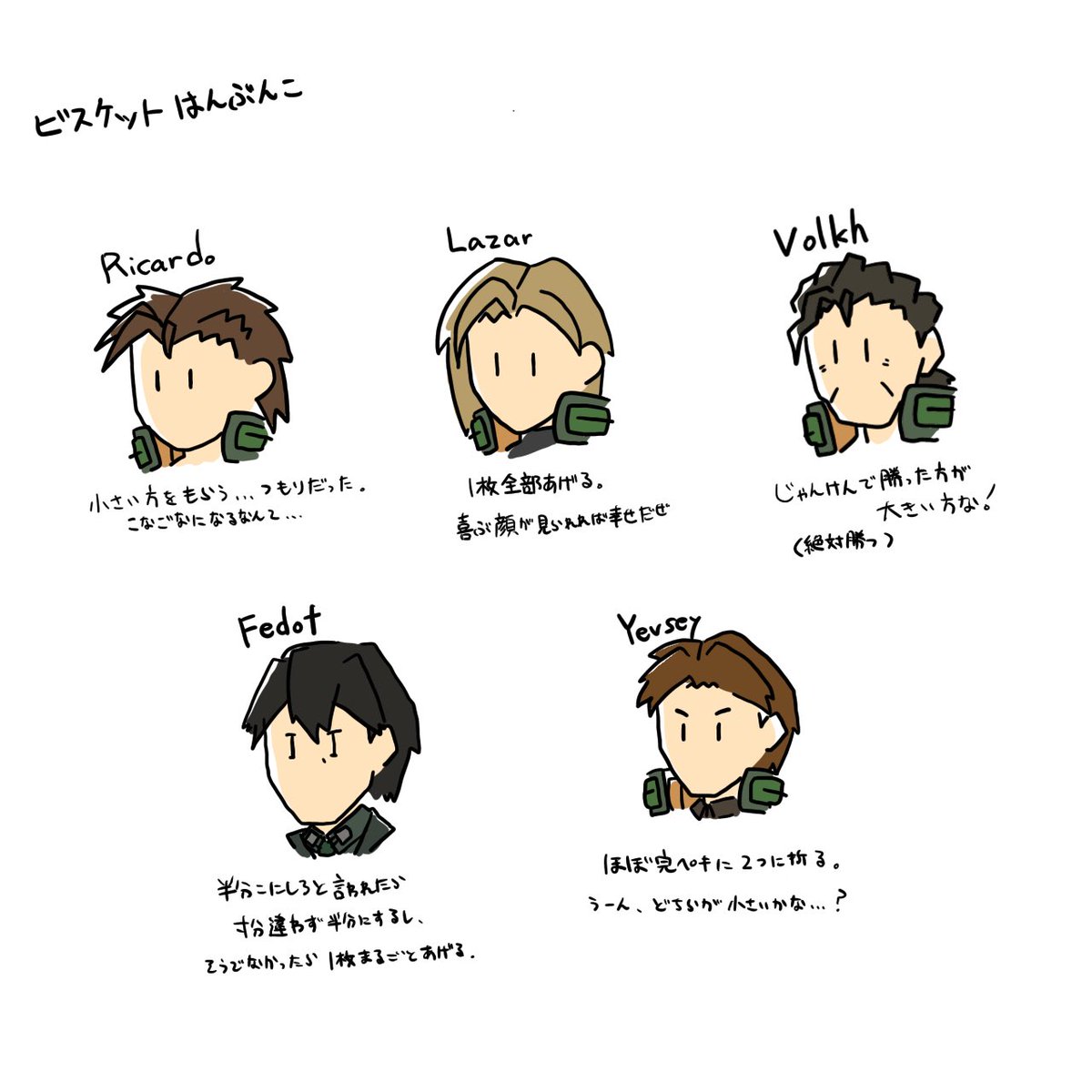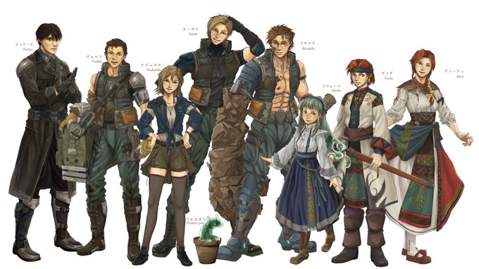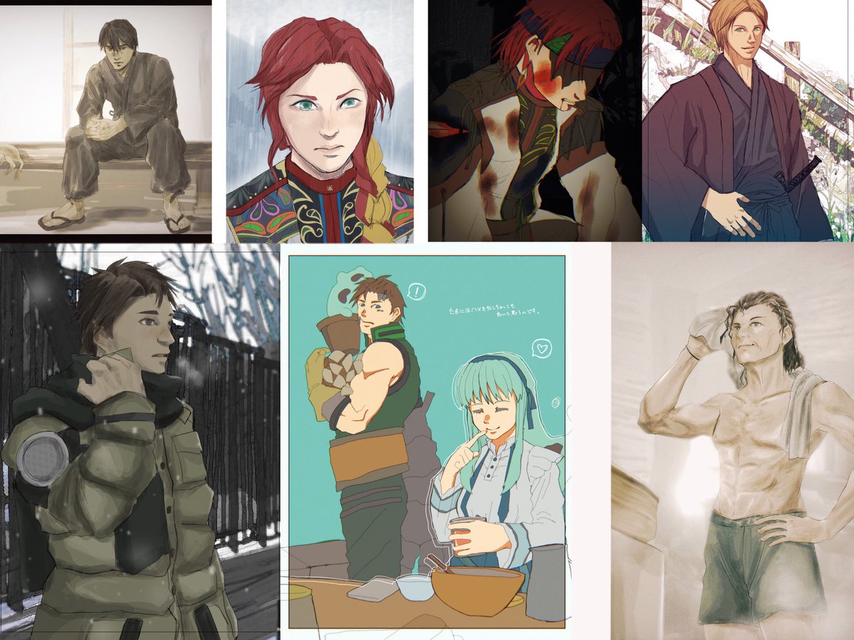 #このタグを見た人は自分の絵柄の目部分を見せる 全員緑がかった碧眼だが、 <青> リカルド(1枚目) ↓ アリョーナ(2枚目) ↓ ラーザリ(3枚目) <緑> である。 アリョーナは違うが、ウクラド国の住民は青、緑、茶、黒の虹彩が多い。