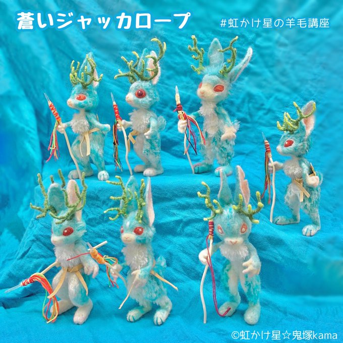 ヴォーグ学園 #虹かけ星の羊毛講座 「蒼いジャッカロープ」🔵🐇🦌 9月に完成した東京校生徒さんとの記念撮影👏かわいい 杖(槍に見えますが!)までが標準装備 その他は時間がある方のでナイフがあったりなかったり。ナイフは鞘から出せます #虹かけ星 #羊毛フェルト