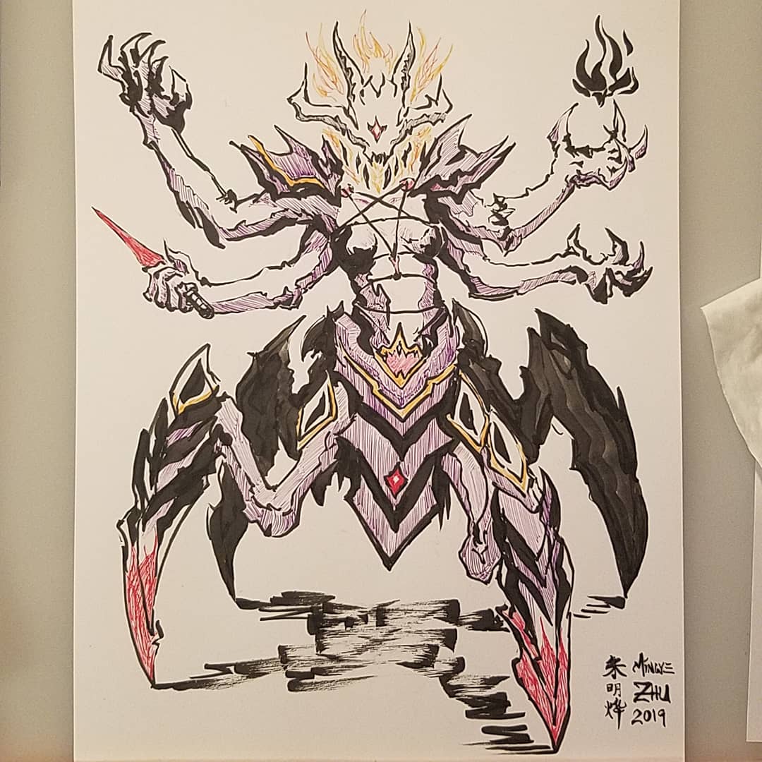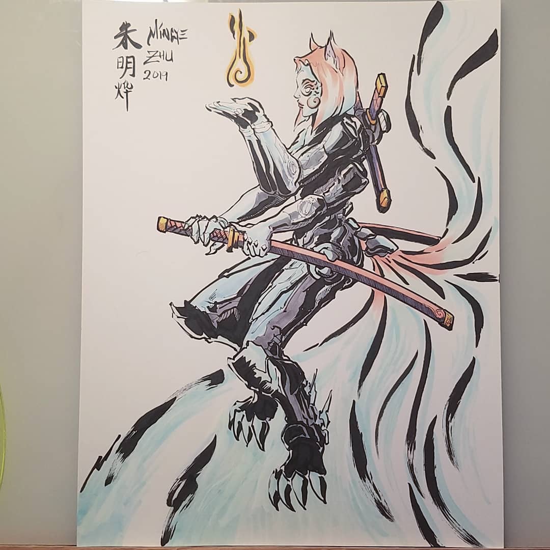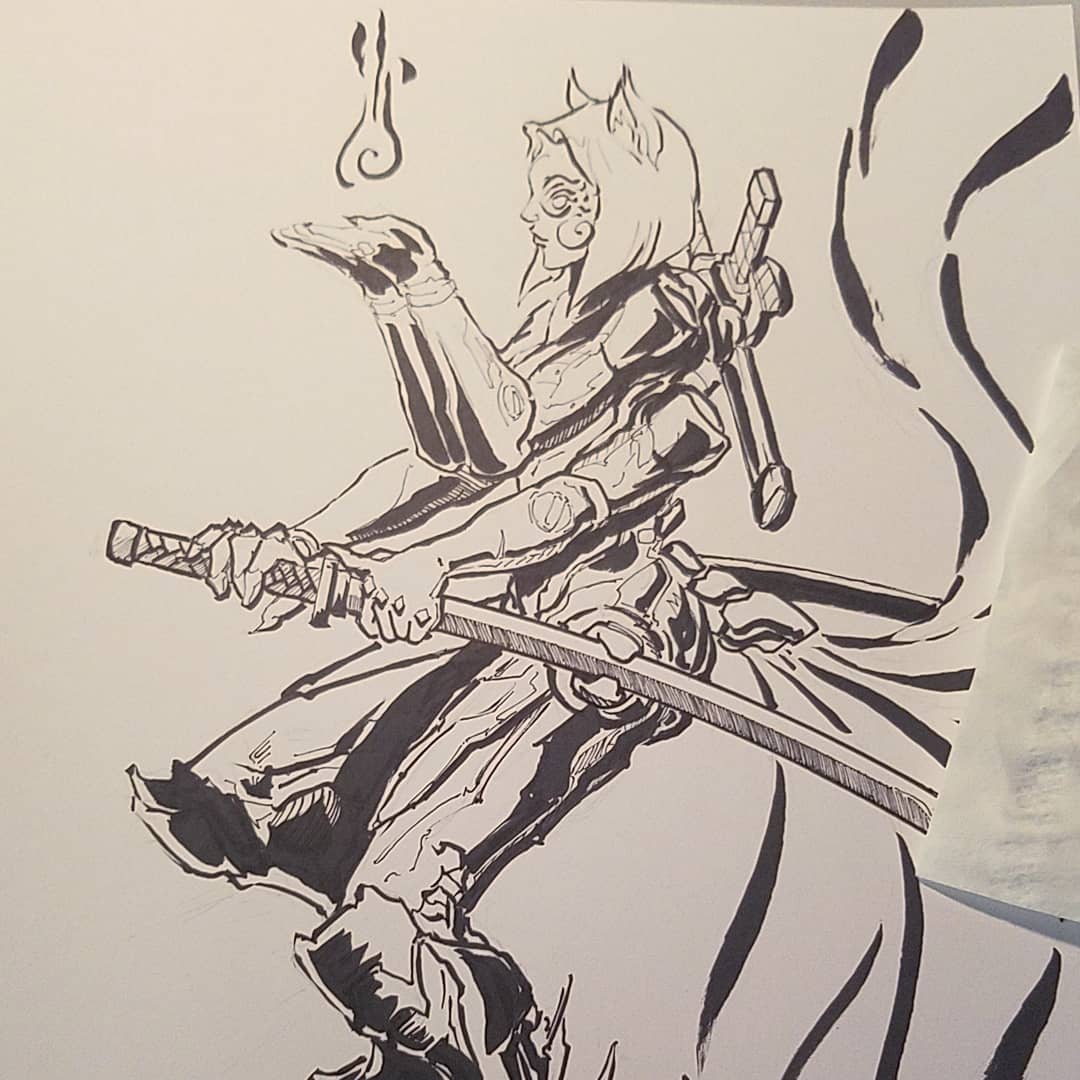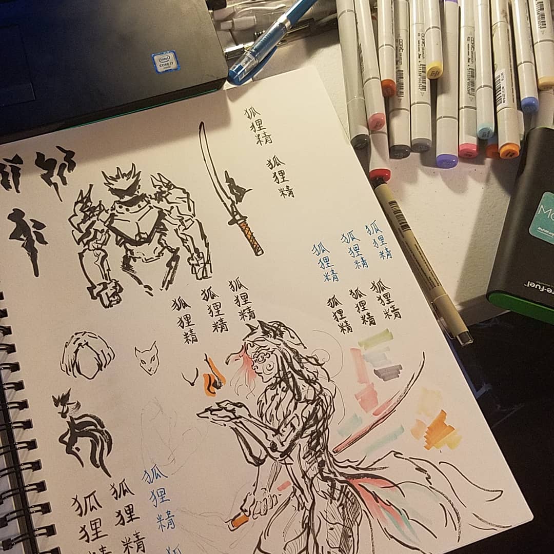 Repost for the art account. #Inktober #Inktober2019 A cyberpunk nine-tailed fox. Still riffing off that color palette from the Kochou drawing. Full ideation process on Instagram. Copic overkill though.