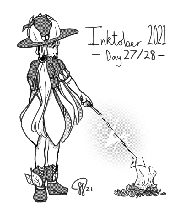 Caved in and did digital again (and also combined two days into one drawing). So that's four prompts (I'll count them)... A witch inspired by nightshade (1) creating a spark (2) with an athame (3) to light a pile of crispy (4) leaves. #inktober #inktober2021 #digitalart #witch