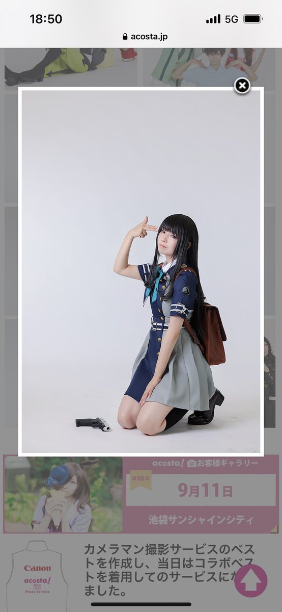 アコスタには何回も参加してたけど、今回初めてカメラマンサービスを利用させていただきました🔫 (′ω’ 🔫)バキュン! リコリコのたきなちゃんコスは初出しもあってめっちゃ緊張してた笑 素敵に撮っていただき本当にありがとうございました✨ #アコスタ池袋 twitter.com/hacopr/status/…