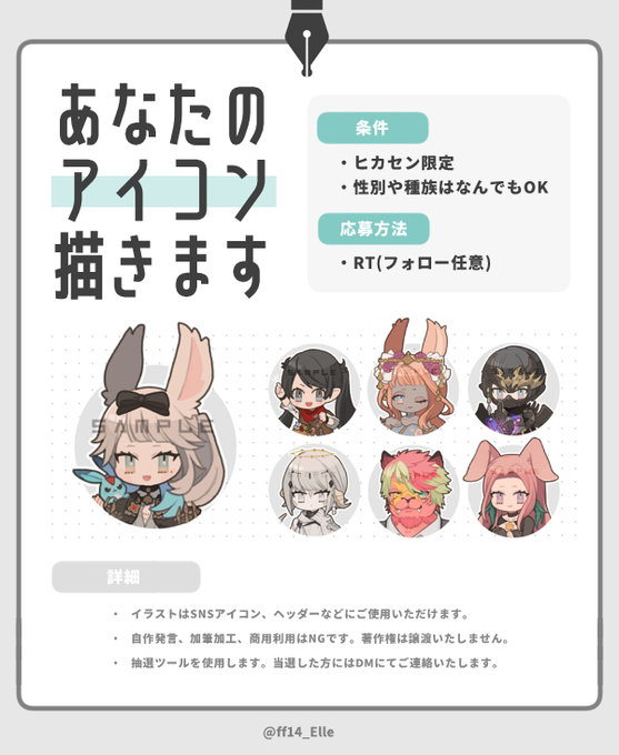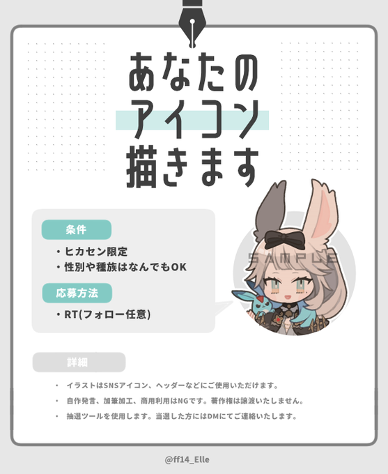 2236 1152 🌱FF14アイコン企画🌱 応募方法┊RT(フォロー任意) 募集期間┊4/8(土) 23:59まで 当選人数┊1人 はじめての募集で緊張しています 人が描いたうちのこが見たい!アイコンがほしい! そんな方のご応募お待ちしております🙇♂️ #FF14 #FF14イラスト #アイコン企画 23/04/04 17:38