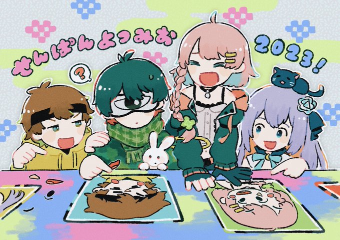 63 400 新年さっそく4人の集まりが見られるのうれしうれしたのしみです!!!!🌟 #せんぱんよつみお #せんたんあーと #ちんぱんあーと #よつはがき #みおあーと 23/01/07 00:23
