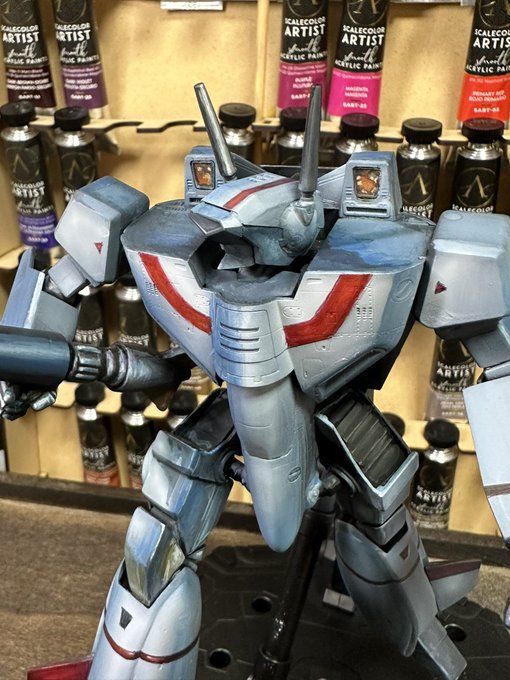 #これはプラモです 高荷イラスト風塗装バルキリー完成です! 一度、塗装を全てやり直す大失敗を乗り越えて、やっと完成させる事ができました。 塗装の様子をyoutubeにアップしましたので、是非観てもらえると嬉しいです! youtu.be/F9PVntCK9AQ