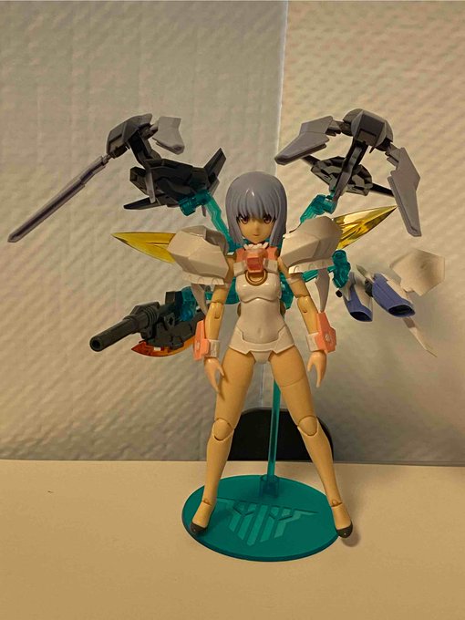 2 3 ツインテ削ったり細部調整したりしたけどここまで作っちゃうと変化に乏しいね とりあえずアルナイルロッド作った もう一つ武器は作る予定 あとは色塗るまでこんな感じだろうから黙々するかも #メガミデバイス #FAガール 22/11/06 07:36