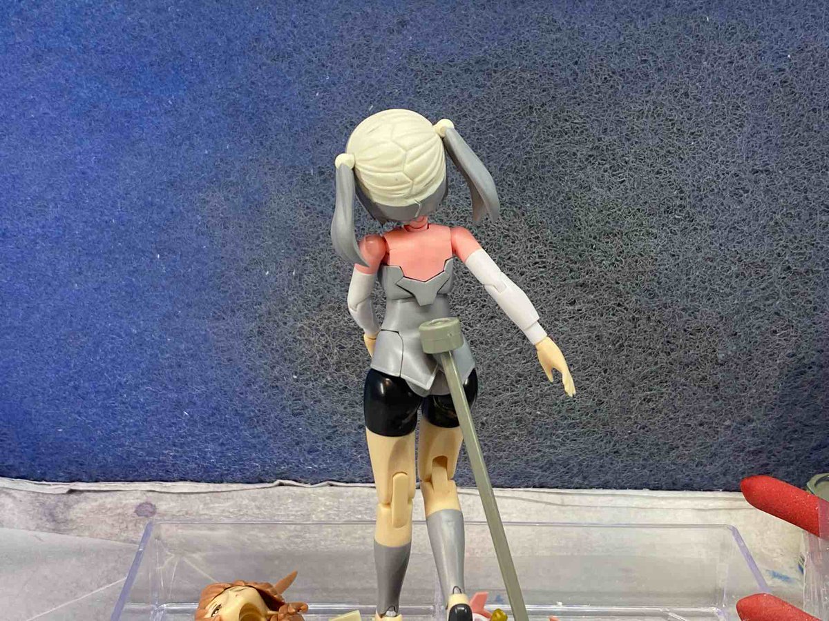 1 5 違和感あるツインテをかなり削り込み、多少はマシになった…かな あとはパテ盛りしたとことバランス見るのに胴体をサフ吹き やっぱり脇腹少し削ろうかと そいえばメガミボディだけどFAガールでもあるからタグ追加します #メガミデバイス #FAガール 22/10/10 20:55