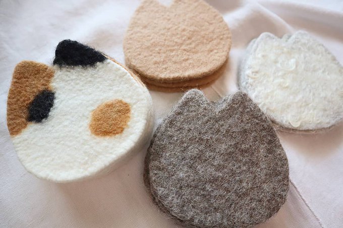 スクエアコースターとポットマット ロムニーというしっかりした品種の羊毛でお作りしています Have a good day Motoyawata @ichikawatezuku 4/9 10:00〜16:00 葛飾八幡宮参道(千葉県市川市) #haveagooddaymotoyawata #市川市 #本八幡 #羊毛フェルト #水フェルト #wetfelting #wetfelted #クラフト