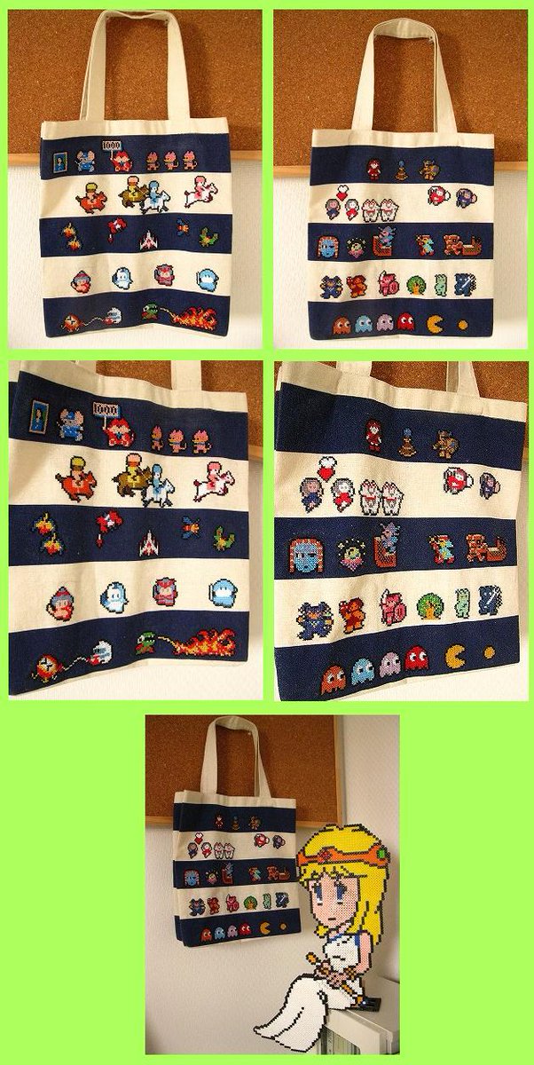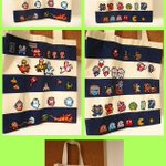 ナムコかばん完成! 表はマッピー、ファミリージョッキー、ギャラガ、貝獣物語、ディグダグ。裏はドルアーガーの塔、スカイキッド、バベルの塔、ワルキューレの冒険、パックマン。FCナムコ作品に大感謝の作品です! #8bit_shugei