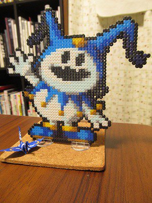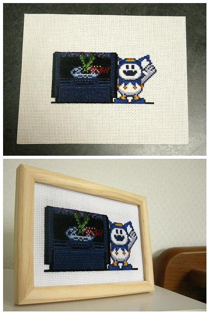 くつわ(@ktwfc)さんが描かれた「FC/女神転生2ROM&ジャックフロスト」ドット絵(twitter.com/ktwfc/status/5…)が素晴らしかったので許可を頂き刺繍していたものが完成しました!くつわさん、ありがとうございます!