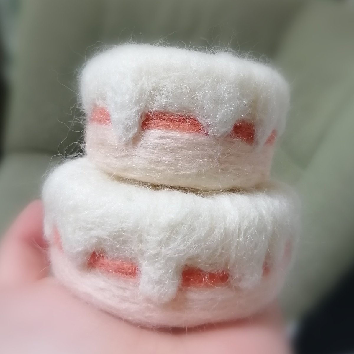 ウソだろ… 3時間チクチクして… 出来たの🎂土台だけ…だと? しかもまだケバケバすごくて 完成とは言えないし😂 寝ますっっ[▓▓]_˙꒳˙)_ #羊毛フェルト #ハンドメイド #ケーキ