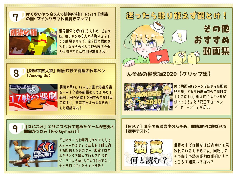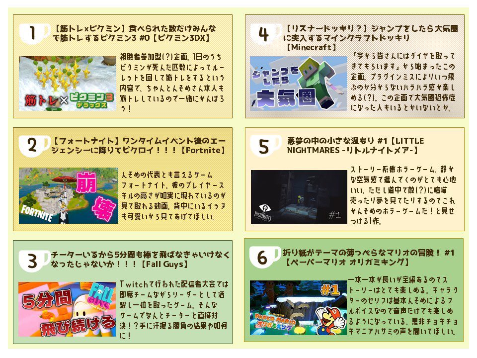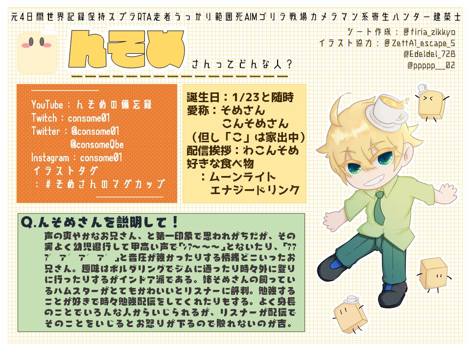#そめさんのマグカップ 「そめさんってよく聞くけどどんな人?」って方を最近よく見る(当社比)ので布教シートを作りました☀️ 『動画で興味持ったので配信みたい!』って方は是非Twitchへ🙌🙌 (尚情報は2021年2月時点の内容です。)
