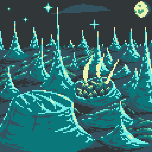 A late #pixel_dailies today. An icy scene! Spires of ice rise from the landscape, and nestled amongst them, a small town! Kinda apt timing, massive snowstorm is coming for me tomorrow! #pixelart #ドット絵 @Pixel_Dailies