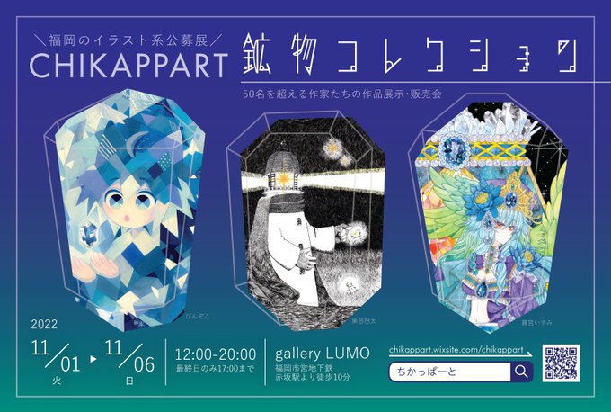 【展示のお知らせ】 #CHIKAPPART さん主催の公募展「鉱物コレクション」に額装2点、小作品3点で参加させていただきます。 メインビジュアル気合い入れて描かせて頂きましたので、ぜひ原画で楽しんで頂けると幸いです☺️新刊も出るよ〜! 会期💎11/1〜6(12〜20時) 会場💎gallery LUMO(福岡)