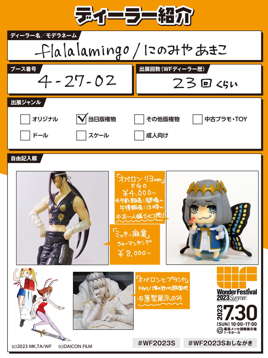 7/30ワンフェスのお品書きです🧚♂️ 「flalalamingo」4-27-02 新作「オベロン リヨver.」¥4,000 ※1人1限 ※午前と午後(13時~)で販売を分けます。 再販「ミッキー麻倉」¥8,000 展示のみ「オベロンとブランカ」 販売物は未塗装未組み立てのガレージキットです。 #WF2023S #WF2023Sおしながき