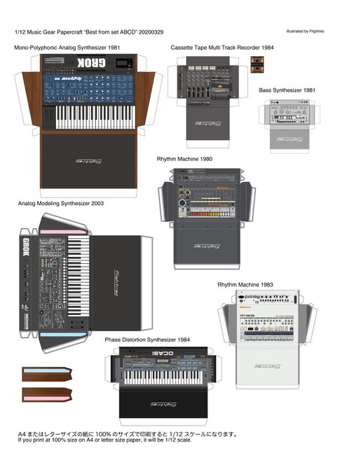 暇つぶしにシンセやドラムマシンのペーパークラフトでもどですか?すべて1/12スケールなのですから色々楽しく遊べる思ます。まずは頒布中のセットから選りすぐったお試しフリーセット。リンク先からダウンロードでけます。 flightrec.com/archives/2096