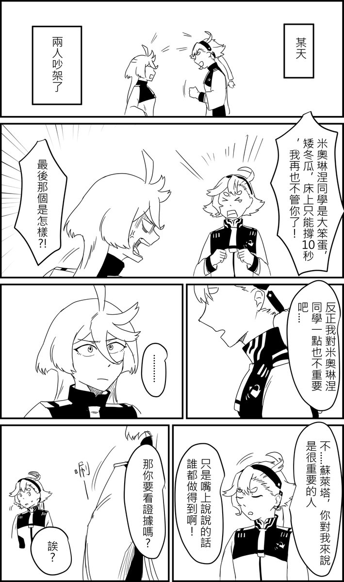 49 290 有些人說米米跟她老爸一樣什麼事都不講獨自下決定,但是這要怎麼跟蘇萊塔說呢? 米奧琳涅:「蘇萊塔你聽我說,其實我們兩家是世仇,你媽把你養成媽寶就只是為了利用你方便當成復仇的工具,我聽她說的要當上總裁換你的自由,為了當上總裁我必須跟古爾締結婚約,所以你要決鬥輸給古爾」 蘇萊塔:「蛤?」 23/05/08 04:32